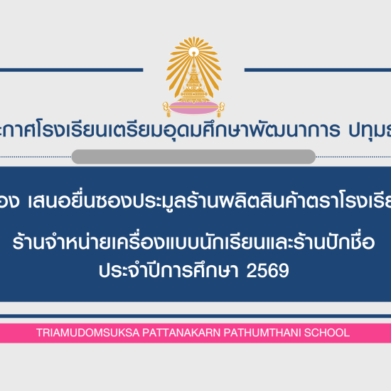 ประกาศผลพิจารณาประมูลร้านผลิตสินค้าตราโรงเรียน December 12, 2025 0 0 จัดซื้อจัดจ้าง ประกาศโรงเรียนเตรียมอุดมศึกษาพัฒนาการ ปทุมธานี ตามที่โรงเรียนเตรียมอุดมศึกษาพัฒนาการ ปทุมธานี มีความประสงค์จะคัดเลือกผู้ประกอบการ เพื่อผลิตสินค้าตราโรงเรียน เพื่อจัดจำหน่ายและให้บริการกับนักเรียนโรงเรียนเตรียมอุดมศึกษาพัฒนาการ ปทุมธานี ประจำปีการศึกษา 2569 นั้น การพิจารณาคัดเลือกได้ดำเนินการเสร็จสิ้นเรียบร้อยแล้ว ตามไฟล์แนบ ไฟล์แนบประกาศผู้ชนะ LibraryPhysics