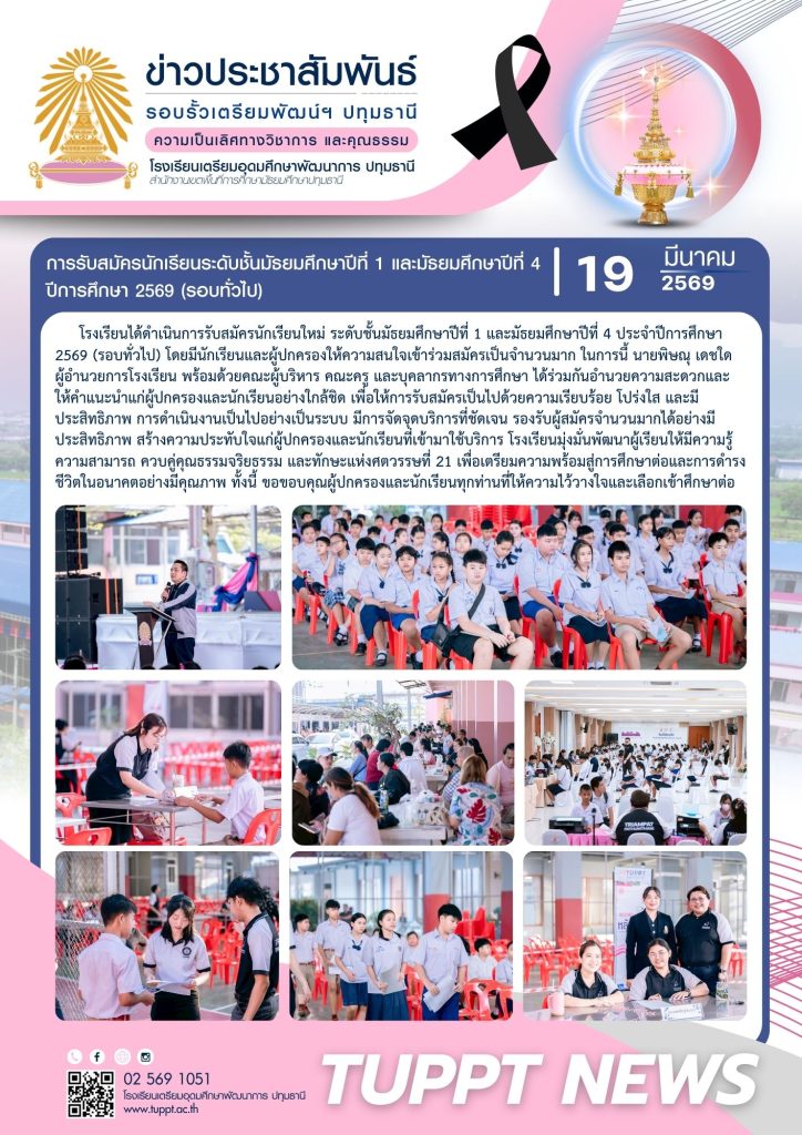 โรงเรียนได้ดำเนินการรับสมัครนักเรียนใหม่ ระดับชั้นมัธยมศึกษาปีที่ 1 และมัธยมศึกษาปีที่ 4 ประจำปีการศึกษา 2569 (รอบทั่วไป) โดยมีนักเรียนและผู้ปกครองให้ความสนใจเข้าร่วมสมัคร