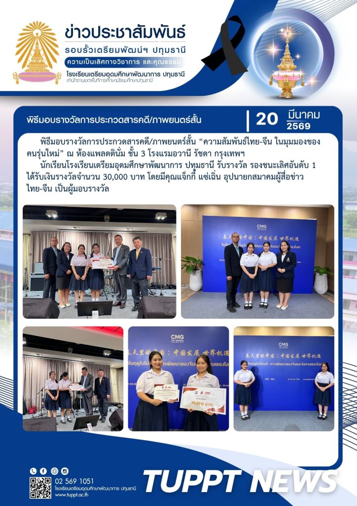 นายพิษณุ เดชใด ผู้อำนวยการโรงเรียน มอบหมายให้ นางสาวภัทรสุดา เงินยวง และนายพิชิต พิมโคตร ครูที่ปรึกษา นำนักเรียนเข้ารับรางวัลรองชนะเลิศอันดับ 1 การประกวดสารคดี/ภาพยนตร์สั้น “ความสัมพันธ์ไทย – จีน ในมุมมองของคนรุ่นใหม่” จัดโดย สมาคมผู้สื่อข่าวไทย – จีน สถาบันสื่อและบริหารธุรกิจไทย – จีน และ China Media Group ณ ห้องแพลตตินั่ม ชั้น 3 โรงแรมอวานี รัชดา กรุงเทพฯ ได้รับเงินรางวัลจำนวน 30,000 บาท โดยคุณแจ็กกี้ แซ่เฉิ่น อุปนายกสมาคมผู้สื่อข่าวไทย-จีน เป็นผู้มอบรางวัล มีนักเรียนได้รับรางวัล ดังนี้
